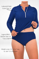This set features our stunning signature design Ladysmith Rash Guard in Deep Blue, Nari Triangle Bikini Top plus our Laguna Full Bum Coverage Bikini Bottom all in Deep Blue - matching elegant, modest & stylish, sun protection swim set! Our signature design rash guard gives you a stylish tailored fitting style rash guard with front princess seams offering chic paneling and a premium luxurious fit. This set includes: