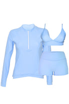 Bundle & Save - Ladysmith (Slim Fit) Rash Guard + Nari Bikini Top + Linne Swim Active Shorties in Light Blue
