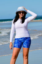 This set features our stunning signature design Ladysmith Rash Guard in White/Pink plus our soft and supportive Nellie 6" Dual Pocket Swim Active Bike Short in Bluehaven - elegant, stylish, sun protection! Our signature design rash guard gives you a stylish tailored fitting style rash guard with front princess seams offering chic paneling and a premium luxurious fit. This set includes: