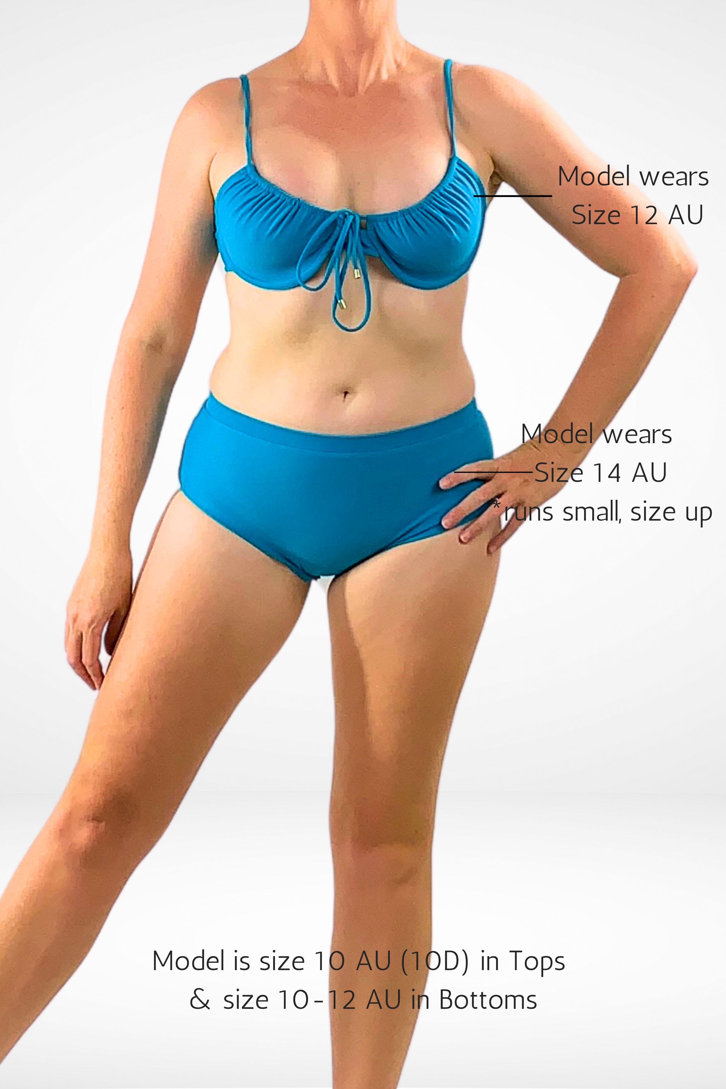 Model wears a size S(8) and is 180cm tall. As a general guide, size S(8) in this style may suit an A-B cup size. Please contact us at info@andaviswim.com if you have any questions about sizing.