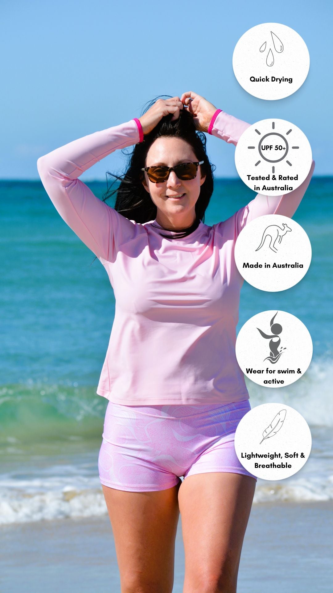Get ready for the perfect combination of style and protection with our Bundle & Save Set - Andi Long Sleeve Active Swim T-Shirt in light pink and Linne Swim Active Shorties in Pink Sands print. This rash guard t-shirt is not only made from tested & rated UPF50+ fabric, but also offers a loose fit for all your active needs, whether you're swimming, playing, or hitting the bar after the beach. Made in Australia with high-quality, eco-friendly Italian fabric that's soft, plush, and UPF50+. This set includes: