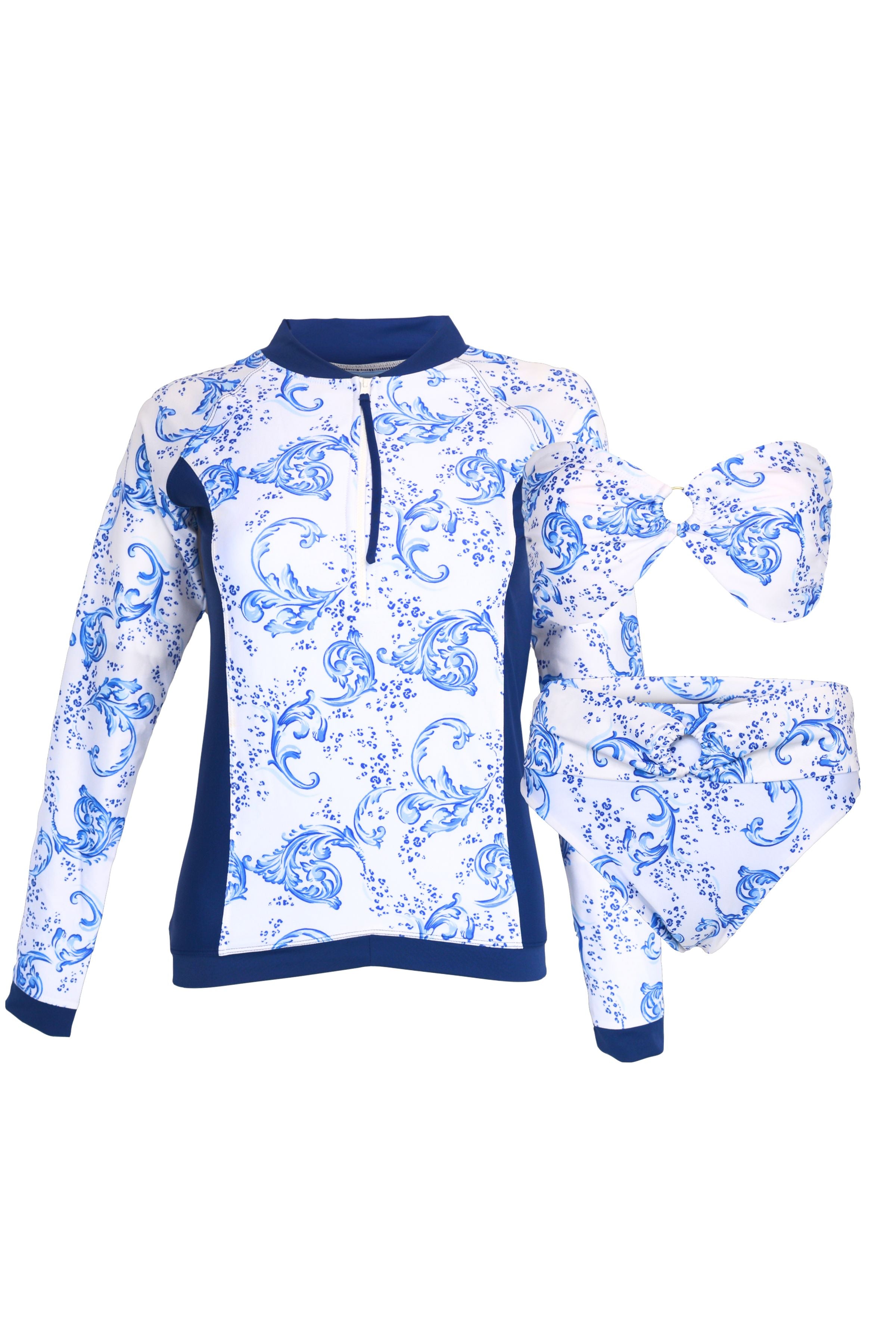 This set features our stunning signature design Ladysmith Rash Guard in our exclusive Whitehaven print, Bandeau bikini top plus our mid-rise bikini bottom featuring a ring waistband detail all in our exclusive Whitehaven print. This set is a lovely matching, elegant, modest & stylish, sun protection swim set! Our signature design rash guard gives you a stylish tailored fitting style rash guard with front princess seams offering chic paneling and a premium luxurious fit. This set includes: