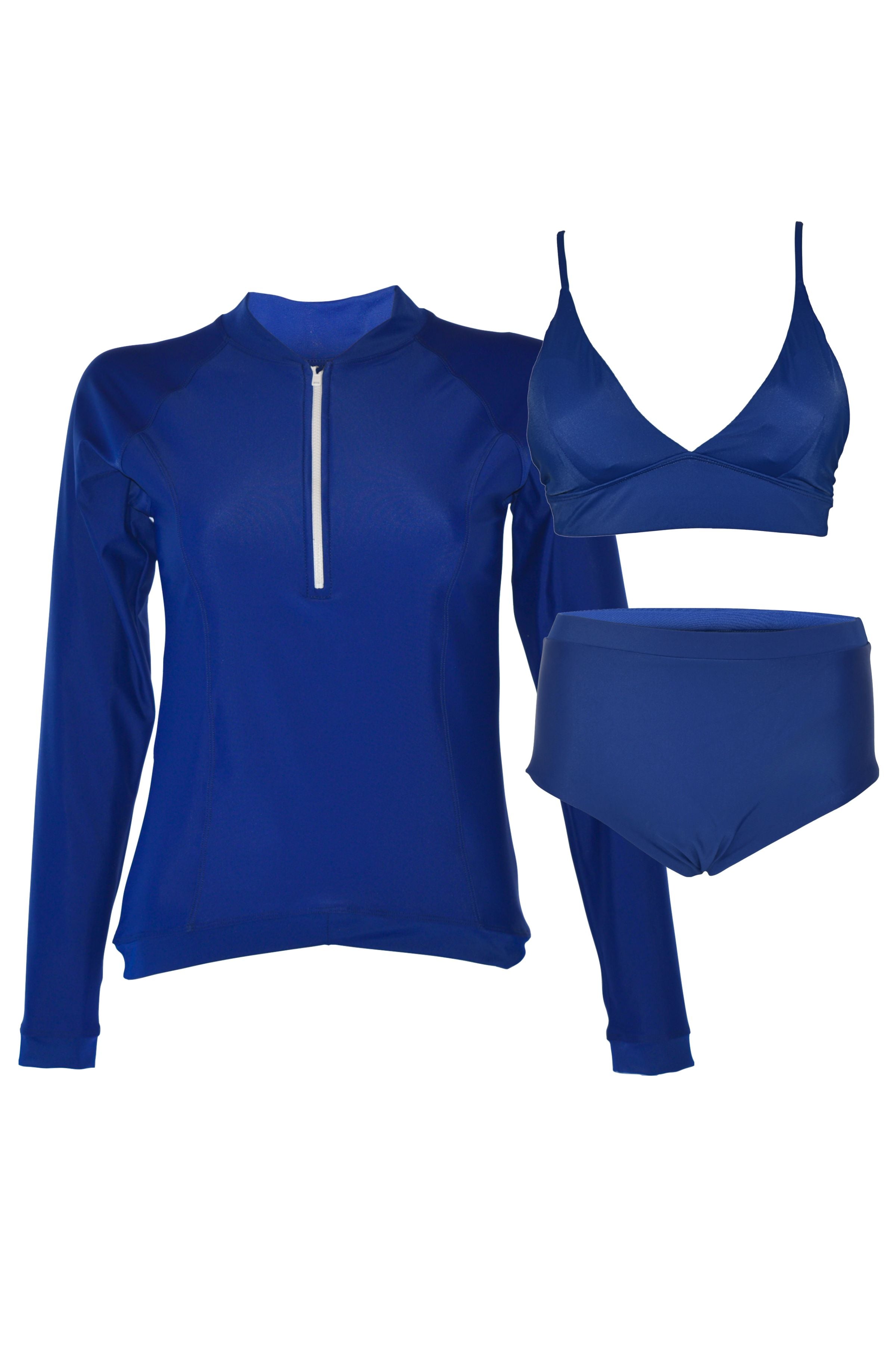 This set features our stunning signature design Ladysmith Rash Guard in Deep Blue, Nari Triangle Bikini Top plus our Laguna Full Bum Coverage Bikini Bottom all in Deep Blue - matching elegant, modest & stylish, sun protection swim set! Our signature design rash guard gives you a stylish tailored fitting style rash guard with front princess seams offering chic paneling and a premium luxurious fit. This set includes:
