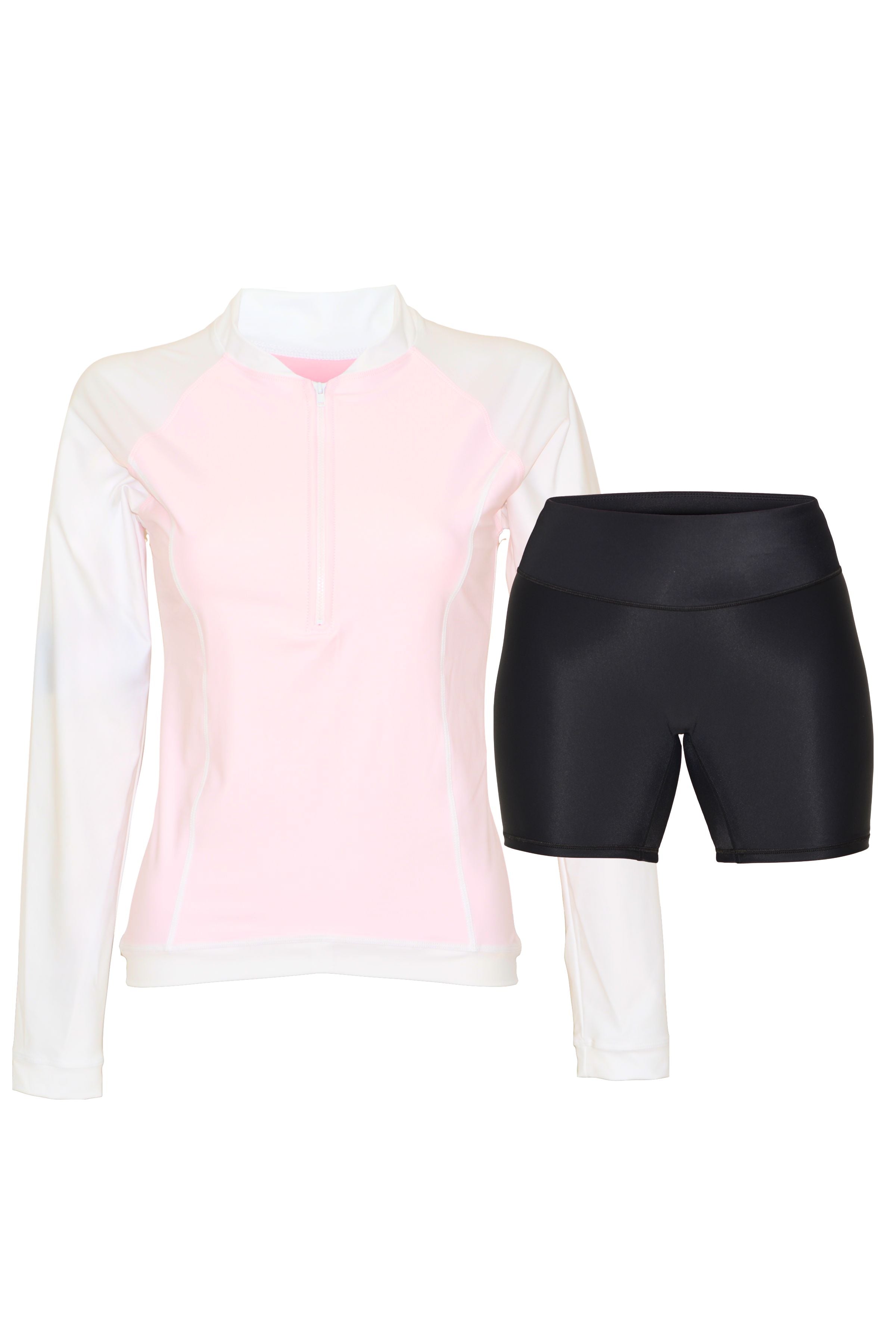 This set features our stunning signature design Ladysmith Rash Guard in Pink White plus our soft and supportive Longer Leg Linne Swim Active Shorts in Black - elegant, stylish, sun protection! Our signature design rash guard gives you a stylish tailored fitting style rash guard with front princess seams offering chic paneling and a premium luxurious fit. This set includes: