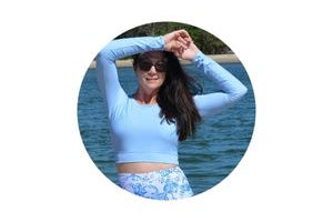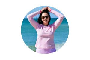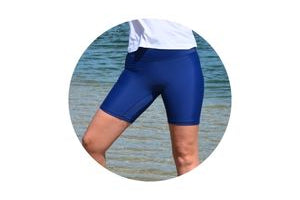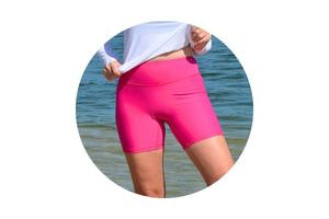 Model is wearing a size 10 in the Ladysmith Rash Guard and a size 12 in the Nellie Swim Active Bike Shorts. Our model is normally a size 10-12.