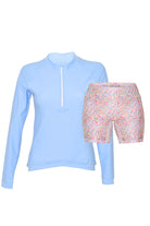 Bundle & Save Set - Ladysmith Long Sleeve Front Zip Rash Guard in light blue + Nellie Swim Active Bike Shorts in Aqua Bloom