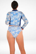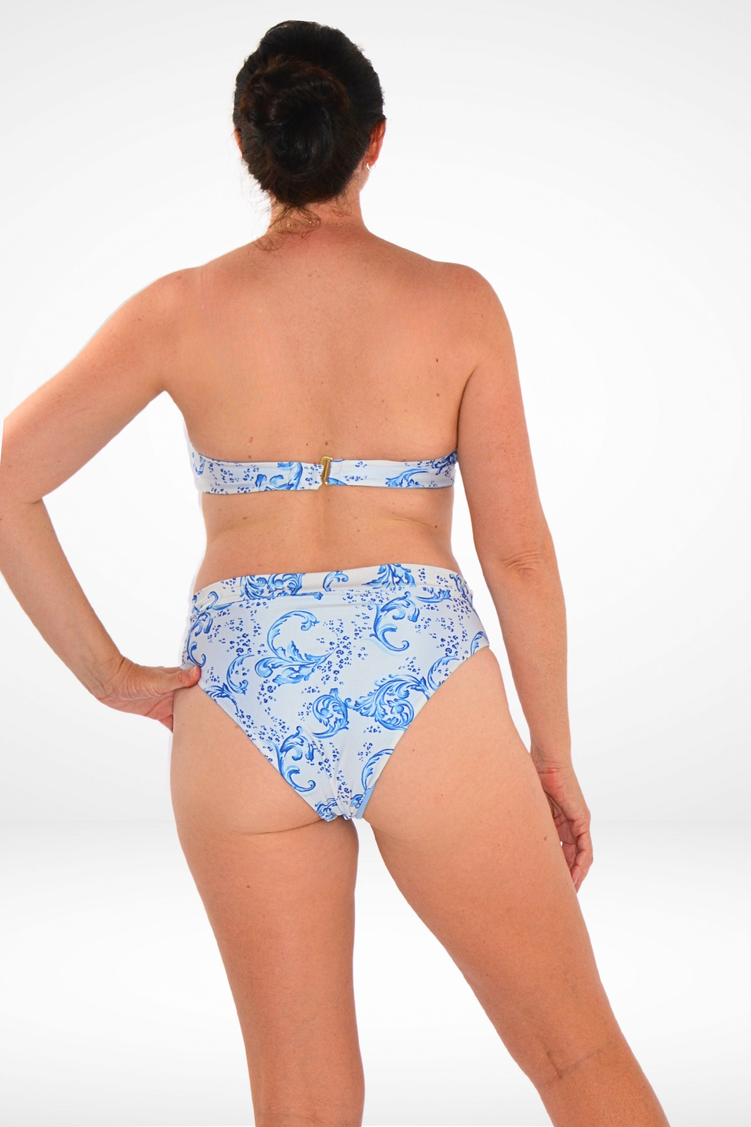 The gorgeous Daydream bikini bottom features a high waist and belt with our exclusive Whitehaven print. The high waist features a flattering front gold circle ruched belt, moderate bottom coverage and seamless double lined fabric. Seamless double fabric swimwear gives a luxurious, comfortable smooth fit, that conforms to your curves and does not dig in.